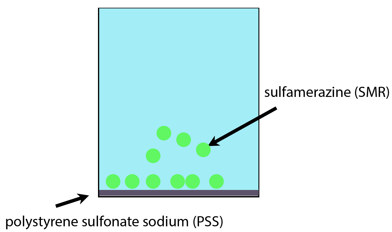 Adsorption is the process by which atoms, ions, or molecules from a gas, liquid, or dissolved solid adhere to a surface. It can be used to extract a certain substance from a mixture. In this study, sulfamerazine (SMR) was adsorbed onto a polystyrene sulfonate sodium (PSS) magnetic material to evaluate the adsorption capacity of PSS for this application. This process is shown in the diagram below.