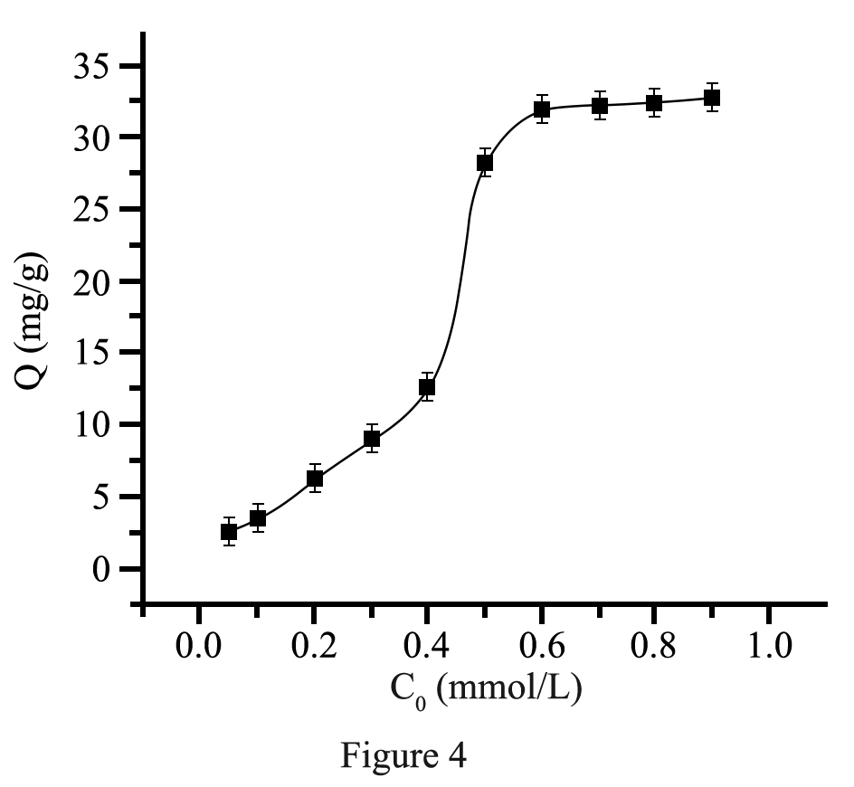 The effect of temperature, time, and pH on the amount adsorbed at an initial SMR concentration of 0.6 mmol/L was studied, and the results are shown in Figures 1-3. Figure 4 shows the effect of the initial concentration of SMR in solution on the amount adsorbed.