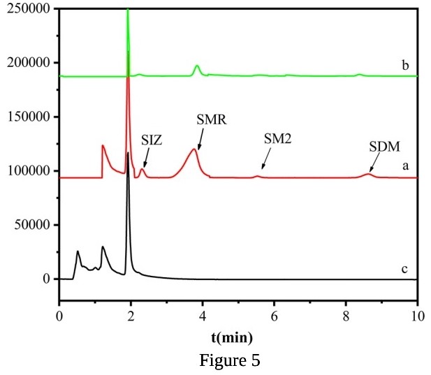Figure 5 shows the results of high performance liquid chromatography (HPLC) of an actual milk sample treated by the PSS magnetic material. Graph “a” shows the SMR concentration in the milk sample before adsorption by PSS. Graph “b” shows the SMR concentration after adsorption, and graph “c” is a blank milk sample that did not contain any SMR.